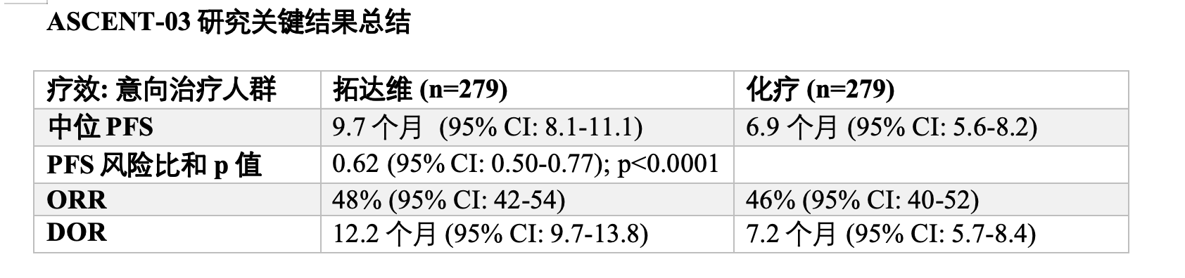 ASCENT-03研究成功达到主要终点PFS,即与化疗相比,拓达维使疾病进展或死亡风险降低了38%。拓达维组的中位PFS为9.7个月,化疗组为6.9个月。拓达维相比化疗的PFS获益在所有预先设定的亚组中均保持一致,包括预后更差的患者(如在根治性治疗后一年内复发)和不同的化疗方案选择。